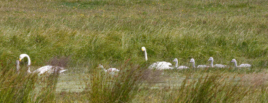 Beskrivelse: Sangsvanepar med 5 danskfødte unger, som vel automatisk får opholdelsestilladelse. Billedet er taget på stor afstand.