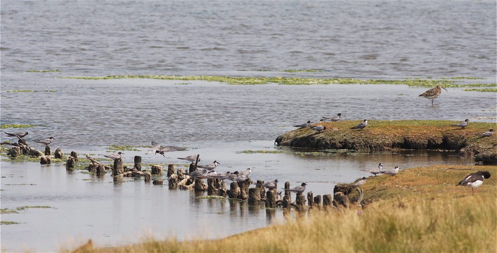 Jeg besøgte stedet sammen med Erik Kramshøj flere gange i dagene 4.-8. juli og så ikke en eneste ungfugl imellem Sortternerne. Derimod op til 85 adulte fouragerende på den tyske side og op til 62 adulte på den danske side, siddende på de samme pæle og den samme tange, som vi ser på billedet. Nogle havde allerede smidt en del af sommerdragten og havde dermed en hel del hvidt i dragten, men nogen ungfugle kunne vi ikke finde. Desværre, for det kan måske tages som tegn på en fejlslagen ynglesæson, i hvert fald for netop disse fugle.