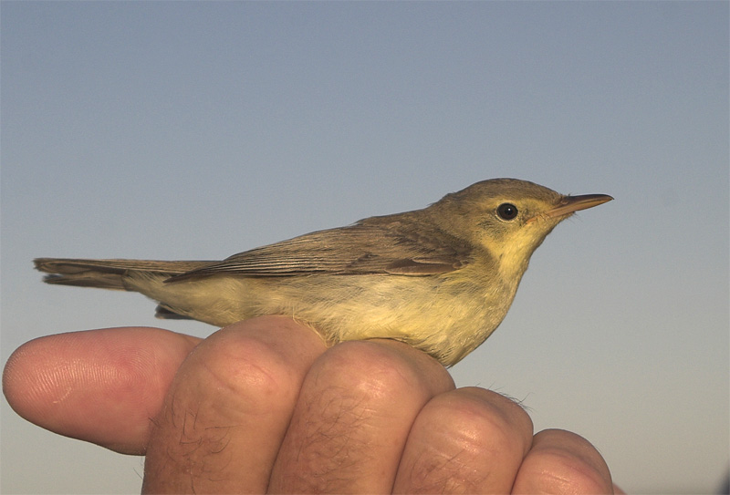 Beskrivelse: Årets 2. Spottesanger ringmærket i Skagen af Rolf Christensen. Nogle biometriske mål: Vingelængde 65mm; p1=3mm>pc; p2=6/7;vingespids (3)4; vægt 14,5g
