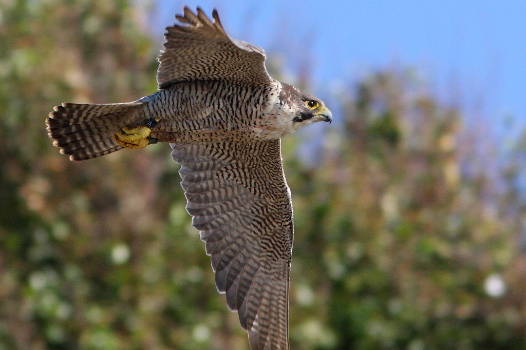 Beskrivelse: Dette er hunnen fra det Bornholmske ynglepar anno 2008. På dette foto lykkedes det at aflæse den mørke ring på højre ben, som bærer bogstaverne AJ. Det viser sig, at hunnen er udruget i en rugemaskine i Hamburg i 2005, hvorefter hun er udsat i et skovområde i Parchim, der ligger ca. 60 km syd for Rostock. De tyske opdrættere håbede at kunne præge fuglen på biotopen skov, men tilsyneladende er den genetiske præference som klippefugl stærk. I hvert fald yngler den nu på Bornholm ved Slotslyngen ca. 300 km fra dens udsætningsted.