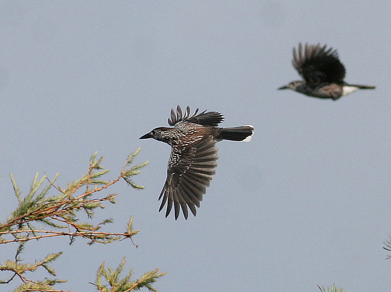 Beskrivelse: Tyknæbbet Nøddekrige med formens typiske "kragenæb" - hos tyndnæbbet meget smallere og mere af form som Stærens. Her ses desuden den tyknæbbede Nøddekriges sorte spidser på mellemste halefjer; normalt er selve spidsen hvid hos Tyndnæbbet.