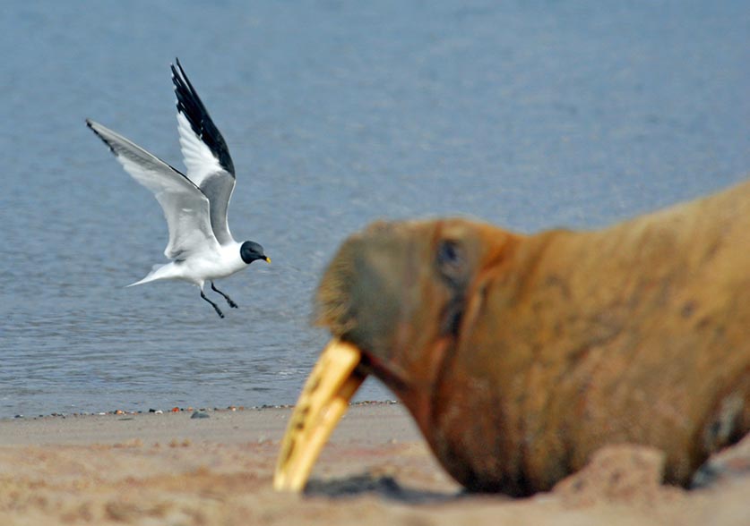 Beskrivelse: Adult Sabinemåge lander i strandkanten nær en af de få regelmæssige rastepladser på land for hvalros.