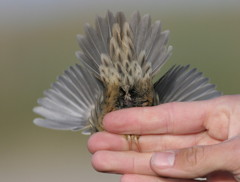 Beskrivelse: Denne fugl så allerede ved "trampet" ud som en helt normal Græshoppesanger: langstrakt og ret kraftig med lang, vifteformet hale. I glimt sås, at oversiden virkede ret ensartet oliventonet. Eventuelle rygter om Pallas´s Græshoppesanger havde intet på sig: Pallas´s har brunere overside, rustbrun overgump og sortere hale med tydeligere hvide spidser.