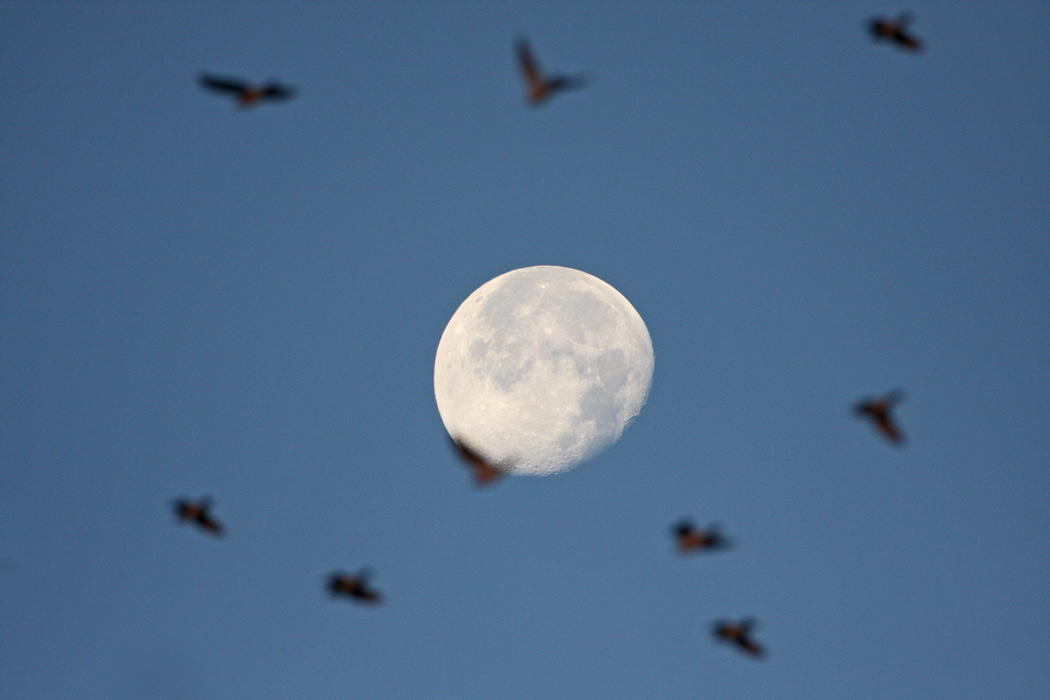 Beskrivelse: Tusindvis af duer har rastet i strandskoven og begiver sig sydpå ved solopgang