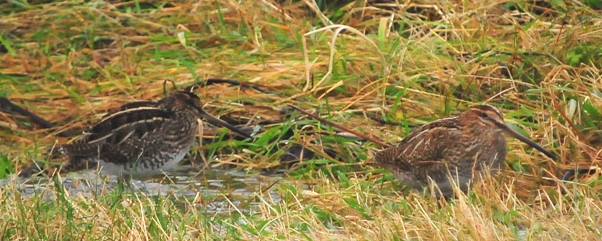 Jeg så den ikke på vingerne, den gik sammen med 14 andre bekkasiner på en oversvømmet mark, de gik for det meste nede i små render og søgte føde, vejret var ret dårligt med storm og regn, fuglen skilte sig dog markant ud fra de øvrige bekkasiner, der vil blive lavet en collage som forhåbentlig vil vise mere end dette enkelte billede.