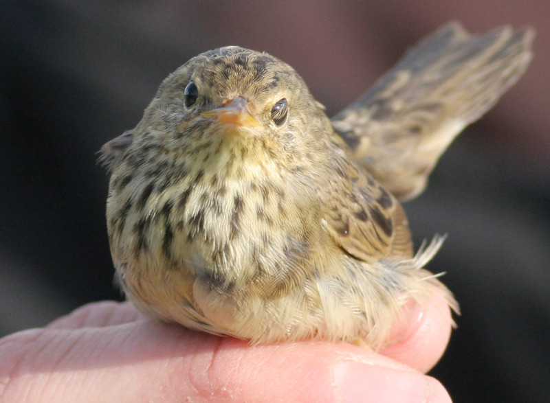 Beskrivelse: Der findes en del andre fotos af Felttræffets bedste fugl på Netfugl, men ingen der helt viser hvordan fuglen så ud direkte forfra. Her bemærker man nemlig de tydelige og sortagtige striber over brystet, der ligner piberes. Græshoppesangere med striber forekommer, men hos disse har striberne mere karakter af længdepletter, og de virker udvandede og gråtonede, hvor Stribet Græshoppesangers typsik er sortere og skarpere afsatte. Bemærk desuden at issens striber virkereligt er - striber, ikke pletter, og det gulbrune (sibir-buff) anstrøg i øjenbrynet.