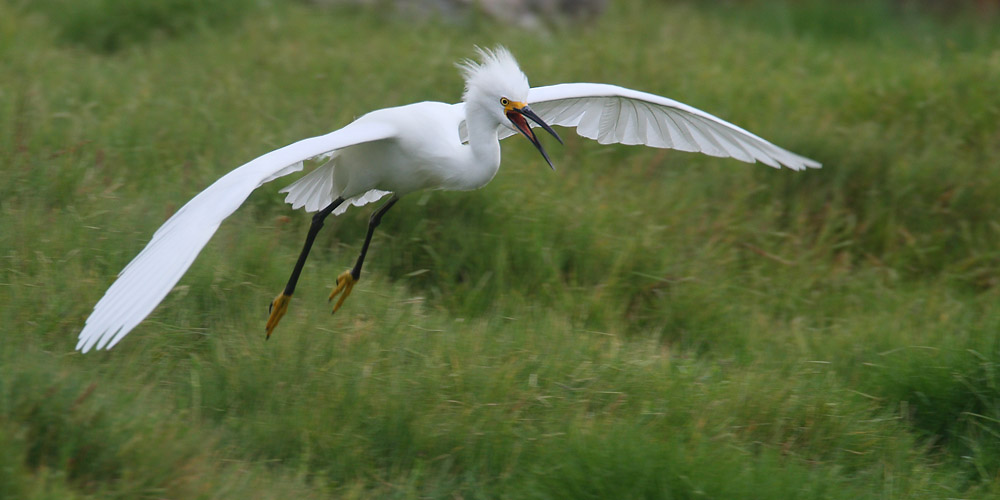 Titel: Flying towards another Snowy Egret to battle about fishing territories.