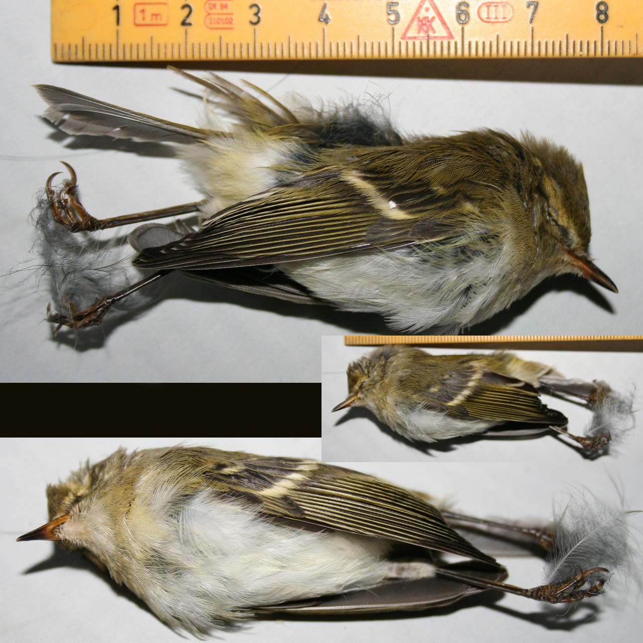 Beskrivelse: Denne fugl blev set i haven hos min faster den 2/10 og fundet død dagen efter, sandsynligvis taget af kat. Hun vidste ikke hvad det var og tog disse billeder som jeg nu har fået. Så vidt jeg kan se må det være hvidbrynet løvsanger - synes dog ikke benfarven er rigtig. Er hvidbryn rigtigt bestemt? Kommentarer modtages med tak.