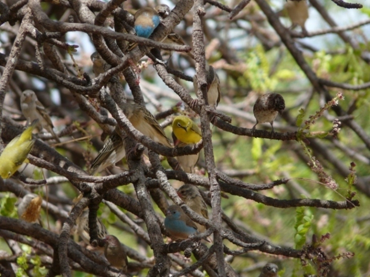 Beskrivelse: En utæt vandledning er guld værd i en tør egn - også for fuglene. Flokken indeholdt bl.a. Yellow White-eye (i midten), Red-billed Quelea (Quelea quelea) til venstre for White-eyen og lidt i baggrunden, Blue-capped Cordon-blue(Uraeginthus cyanocephalus) øverst og nederst, Chestnut Sparrow (Passer eminibey) yderst til højre, Red-billed Firefinch (Lagonosticta senegala) nederst i baggrunden, samt Swahili eller Grey-headed Sparrow (Passer suahelicus/griseus) bagerst til venstre. Find gerne selv flere....