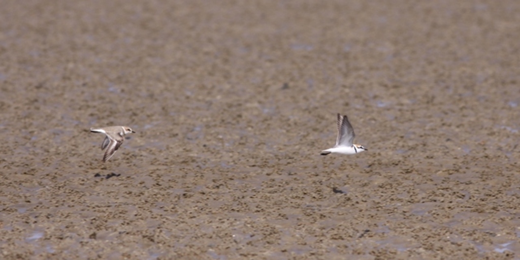 Titel: Over- og undersider af Hvidbrystet Præstekrave. 2 ud af 8 fugle på Søren Jessen Sand