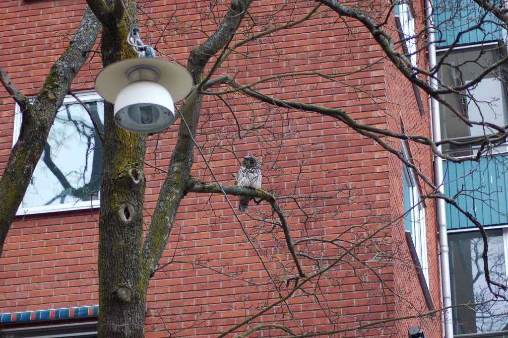 Beskrivelse: Slaguglen fra Uppsala by, har kunnet twitches hele vinteren og foråret igennem. Helge, som uglen er blevet døbt blandt lokale ornitologer, tilføjer store tabstal på Uppsala´s duebestand. Foto: Aase Mielow
