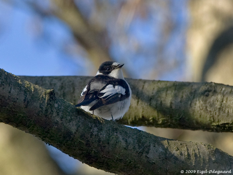 Adult Hvidhalset Fluesnapper har ikke rent sorte håndsvingfjer - de har en anelse brunstik..