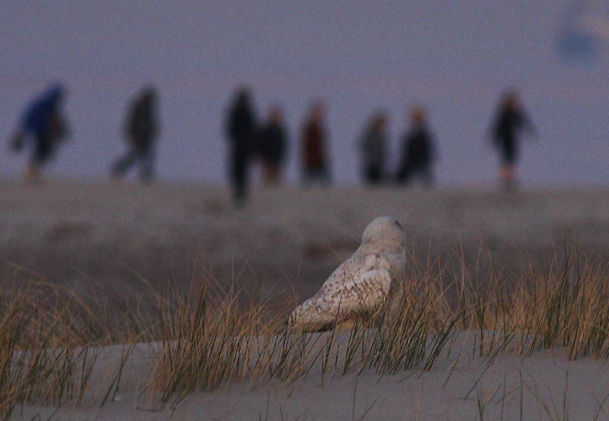 Titel: - uglen kigger nysgerrigt på de mange mennesker, der går aftentur til Grenen