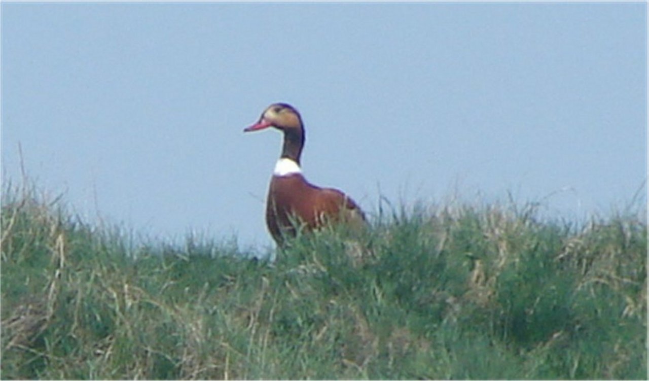 Beskrivelse: Fuglen er fotograferet stående på toppen af en gravhøj. Der var to individer - formentlig et par. Hunnen er brunlig/grålig i stil m. gråand. Parret blev observeret flere gange på samme sted inden for en halv snes dage.