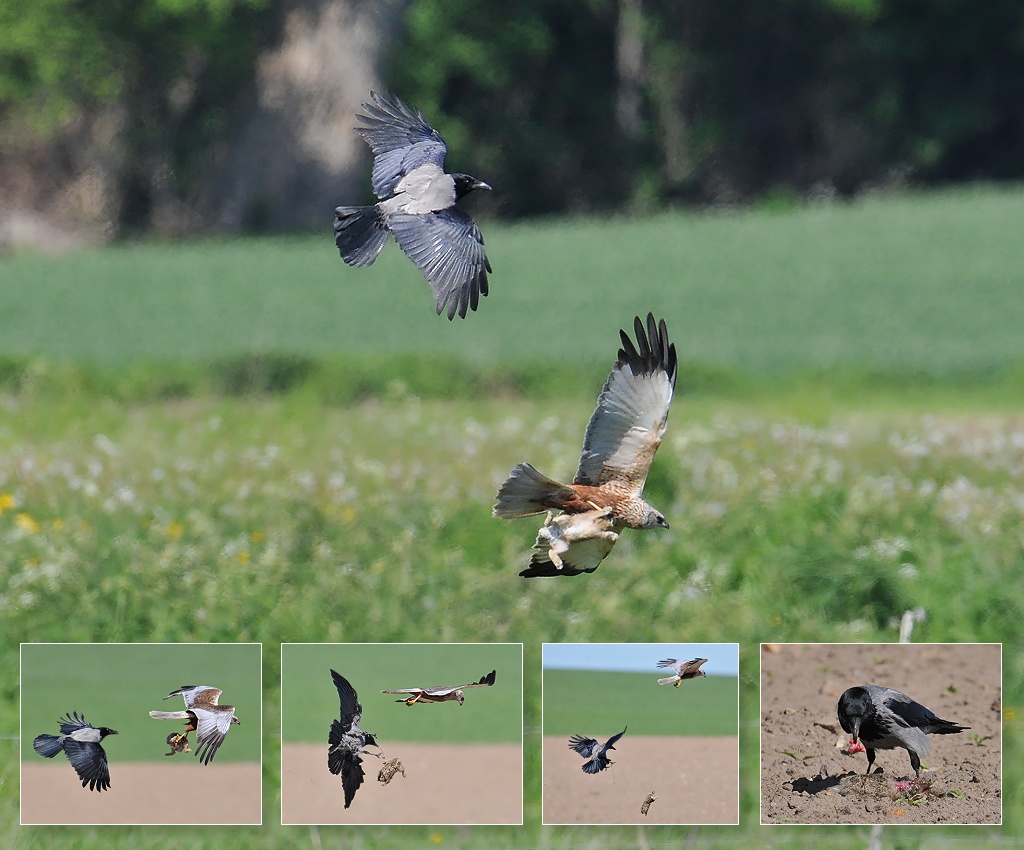 Titel: En krage forfølger en rørhøg og tvinger den til at slippe byttet (harekilling), og så er der frokost
