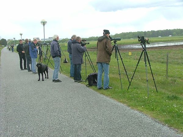 Beskrivelse: På billedet ses bl.a. finderne af den Korttåede Lærke, nemlig Tim Andersen (TA) og René Rantzau (RR). Herudover ses blandt andre Leif Frederiksen (LFR).