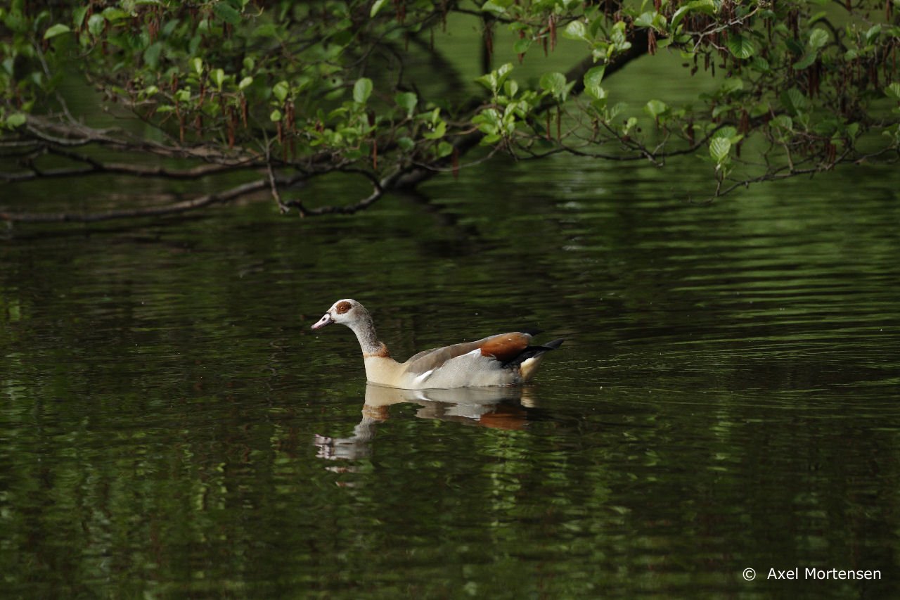 Beskrivelse: Tidlig morgen ville jeg se, om gårsdagens knarand stadig var i skovsøen - til min forbløffelse var der også en nilgås i søen !