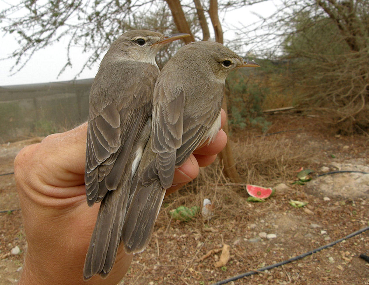 Læg mærke til størrelse og grovhed, men sammenlign også længden på fuglenes tertiærer. Afstanden mellem de 2 yderste tertiærer på orientsangeren er meget kort sammenlignet med den østlig bleg. Denne afstand gør faktisk, at den yderste tertiær hos orientsangeren ser mere ud som en armsvingfjer end en tertiær!