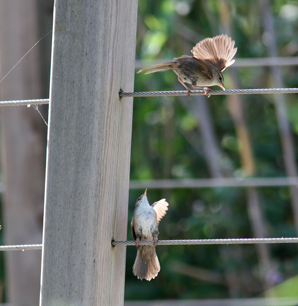 Beskrivelse: Mens vi stor og fotograferede de forskellige Hejrearter i flugt, startede disse to Cettisanger hanner en opvisningskamp om reviret.