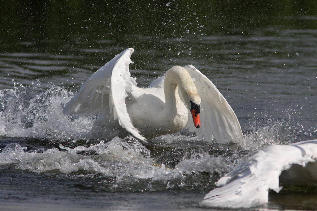 Beskrivelse: Denne særdeles aggressive han havde oprindeligt bidt sig godt og grundigt fast i fyren, der er ved at forsvinde ud af billedkanten. Hele seancen forløb over mindst 500 meter, hvor den fastbidende blev fragtet af sted, mens den anden konstant forsøgte at frigøre sig. Op på land gik det også og derefter ud i vandet igen. Fuglene kom dampende op mod mig, som fredeligt stod i vandkanten og fotograferede en nogenlunde samarbejdsvillig tornsanger. I tilgift fik jeg så en lang fotoserie af denne mageløse kamp.