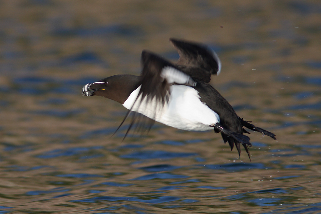 Beskrivelse: Efterhånden yngler der mellem 50 og 100 par alke på klippekysten omkring Hammeren. Billedet taget fra en gyngende jolle.