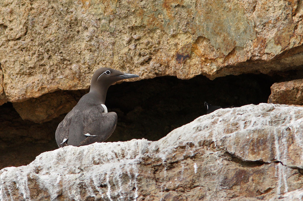 Beskrivelse: I de senere år er der hvert år set flere og flere lomvier på Hammeren. Endnu er der ikke konstateret yngel, men måske til næste år? Billedet er taget fra en gyngende jolle.