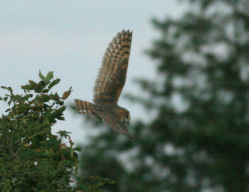 Første slørugle i flugt på natfugl. Godt gået. Mon ikke de klarer den? jeg synes slørugler opfodrer unger til langt hen på året.