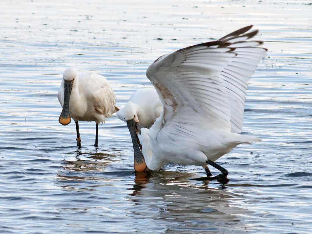Tidligt om morgenen spankulerede Skestorkene med mellemrum rundt lige foran det store fugletårn. Der var tydeligvis tale om forældre og unger. Ungerne tiggede flittigt om føde. De seneste gang jeg har besøgt Vejlerne har der været mange Skestorke (50-100 stk.) men jeg har aldrig set dem så tæt på før.