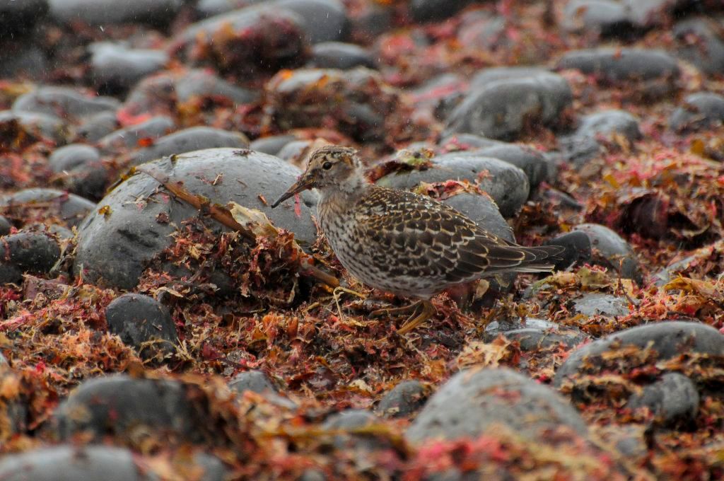 Beskrivelse: All litrature state that that Purple Sandpipers have a long tail and short wings, but note that primaries extend well beyond tail on this juvenile !