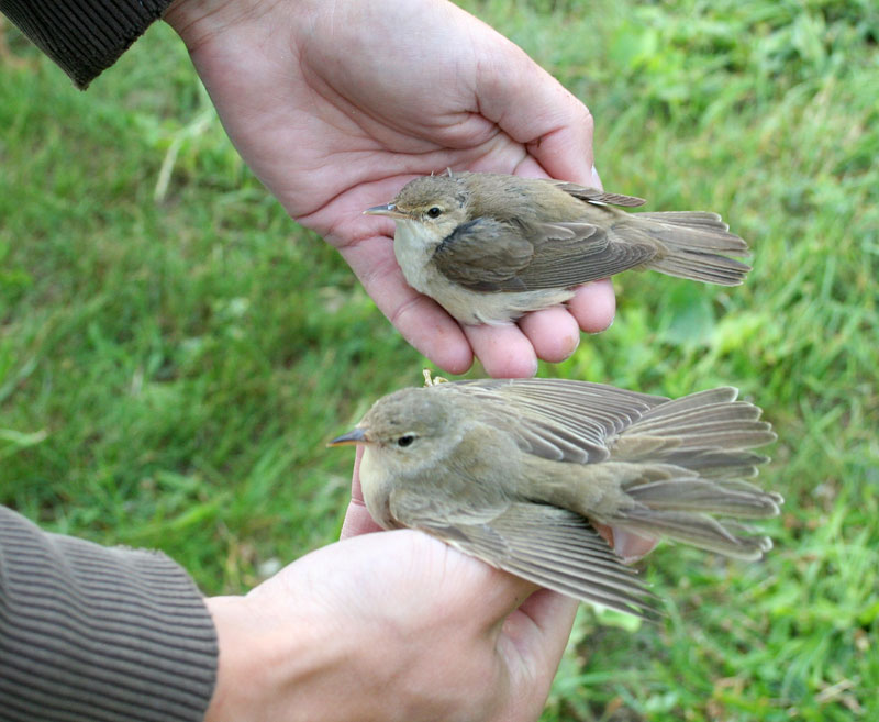 Buskrørs'en ses bagerst med en kærsanger i forgrunden. Der er tydelig størrelsesforskel på de to fugle og Buskrørsangeren kommer til at minde om en phylloscopus sammenlignet med kærsangeren.