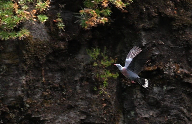 Beskrivelse: I bjergskovene på det vestlige Madeira er en levada der går fra Rabacal til Risco - den ender ved et vandfald med et fald på 100 m. Her så jeg op til 10 Madeira-duer siddende og flyvende i træerne. De første 15 min. så jeg ingen duer - men efterhånden var der lidt bevægelse og så blev de spottet. Der er meget mørkt ved vandfaldet, men fra middag og lidt frem falder der lidt lys ned i området. På levadaturen - var der også Madeira-fuglekonge og Madeira-bogfinke.