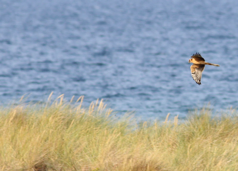 Beskrivelse: Dennne smukke 1K Steppehøg trak ud - efter et kort rast - ved Nabben 0925, og blev senere set indtrækkende ved Stevns. Fuglens tydeligt mørke ansigt - med isoleret hvid plet bagerst på kinden) og distinkt lysorange halskrave mod massive mørke hovedsider - er direkte iøjnefaldende, men i flugten også det ret kortvingede og spidshåndede falke-indtryk. Håndfladen er grålig med markeret sort komme ved knoen, men uden Hedehøgens tydelige sorte spidser på salle håndsvingfjer. Dette får hånden til at virke mørkværdig og karakteristisk kort og utehnet! Ofte et godt første-kendetegn.