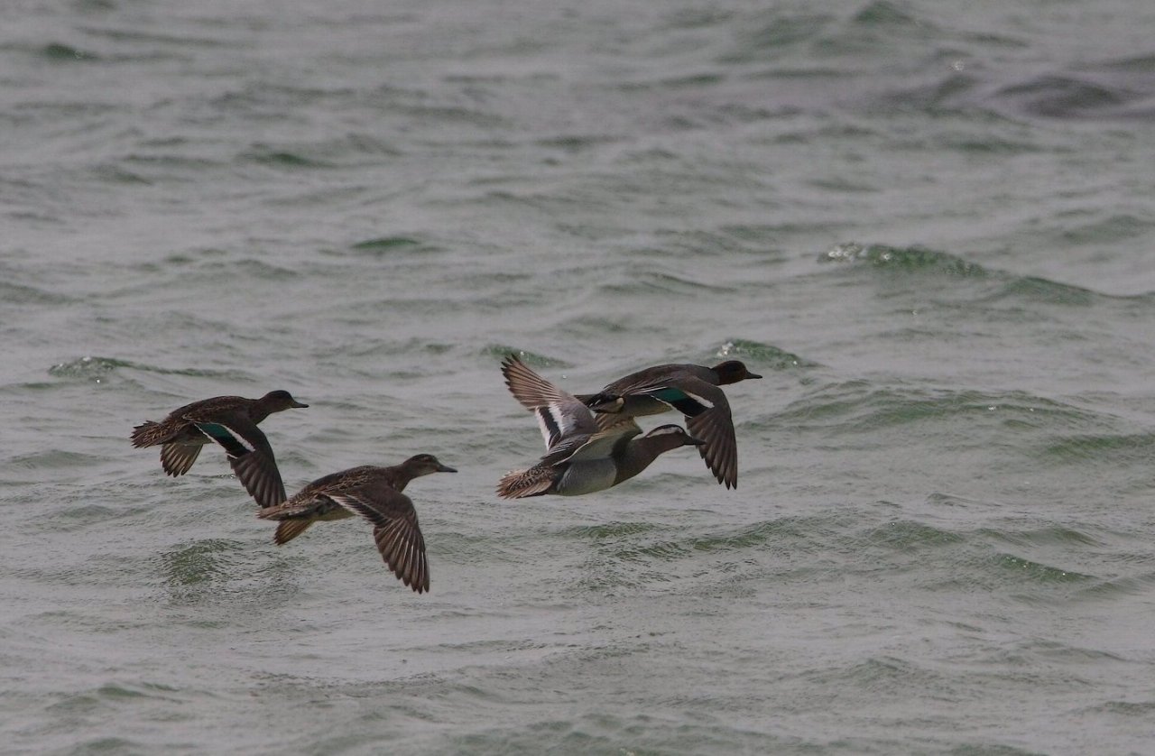 Beskrivelse: En lejlighed til at kigge på og sammenligne hunnernes diskret farvede fjerdragt i flugt: 4 adulte fugle, hunner af Krikand og Atlingand bagest; adulte af samme forrest.