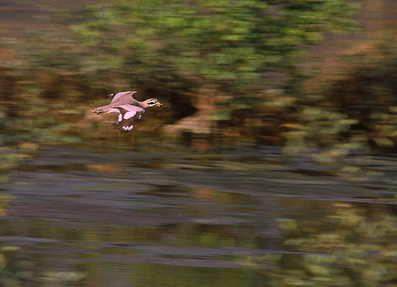 Beskrivelse: GreatThick-knee in flight showing the black secondaries separating this species from Beach Thick-knee (E. magnirostris)