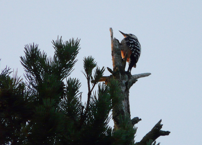 Beskrivelse: Var stået meget tidligt op en morgen for at tage ud i en skov og lede efter bl.a. spætter. Havde lige skænket den første kop kaffe, da et "kjøp" fra toppen af træet på campingpladsen tiltrak min opmærksomhed. Ved første øjekast på spættens ryg opfattede jeg én ting - striber! Jeg behøvede ikke længere kaffe for at vågne.