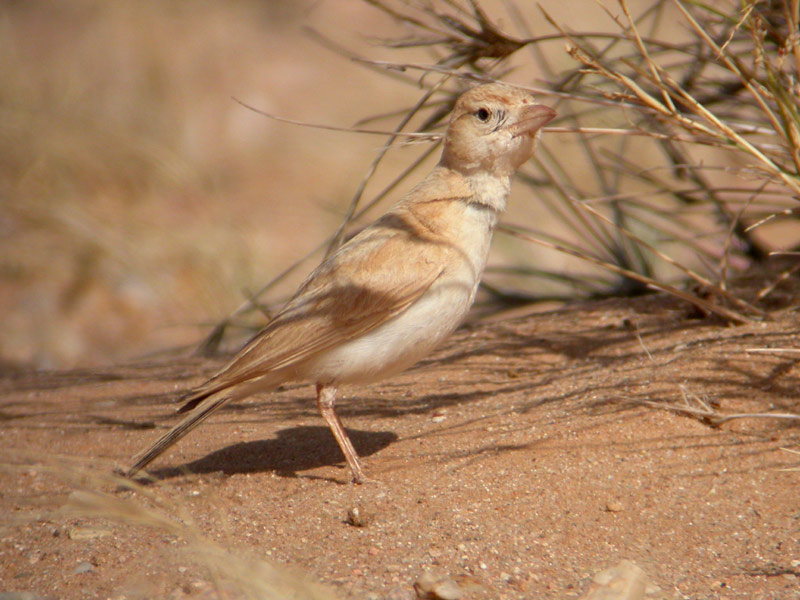 Beskrivelse: Dunn's Lark ssp. dunni: we found this species to be fairly common in suitable habitat along the road from Dakhla to Aousserd. Even a very tame juvenile was lucky enough to escape from under our shoes just in time!