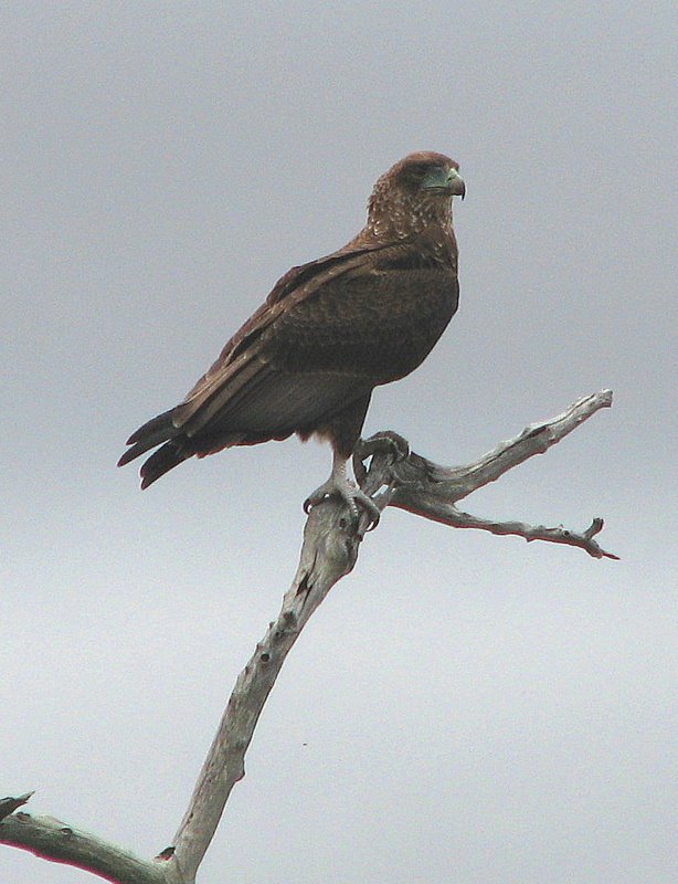 Add to the featherless tarsus and body shape, mentioned by Szilard, the large snake-eagle like head (young Bateleur can sometimes be mistaken for a Snake-eagle when perched), no bright yellow on bill, dark eyes and the short tail - no doubt it is a young Bateleur.