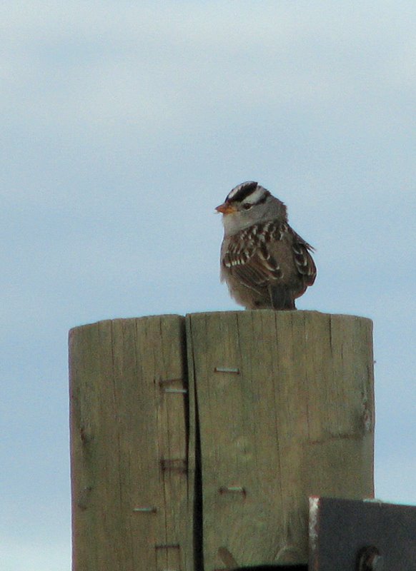 Beskrivelse: Formodentlig den nordlige race Z. l. gambelii pga hvid øjenbrynsstribe foran øjet og orangepink næbfave.
