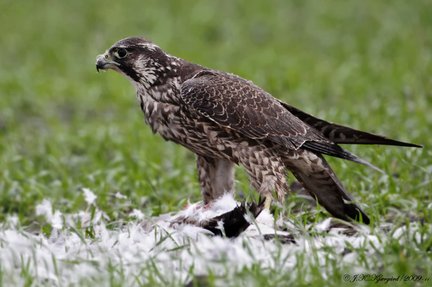 4.Den synlige del af tarsen- og tag her højde for at den nedeste del af tarsen er skjult af byttedyret-er for lang til Jagtfalk. Du vil oftest se at Jagtfalk har store bukser der nærmest rører jorden, og at selve tarsen er mere fjerklædt og derfor virker kortere end hos Vandrefalk, der som her viser en længere, nøgen mellemfod.
