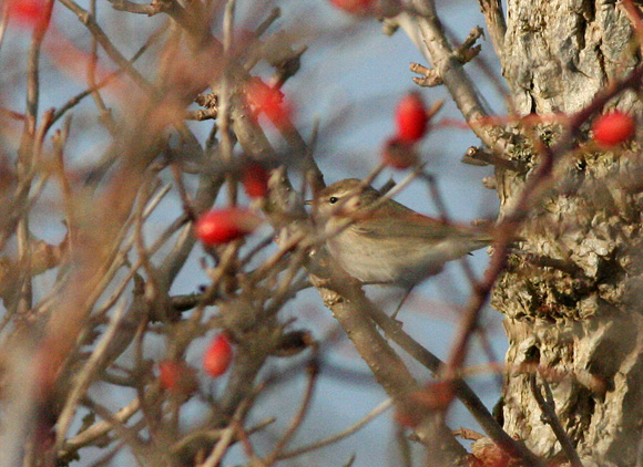 Beskrivelse: Sås den 24.11 langs hovedstien i østenden af diget langs kysten lige vest for de små fiskerhytter. Blev opmærksom på fuglen via kaldet, som i alt hørtes i 5-6 korte perioder, hver gang fuglen fløj hen til en ny busk og gemte sig. Sås dog jævnligt i den halve time, jeg gik rundt efter den, og flere gange sad den ganske fint i læsiden, hvor den af og til fløj op efter dansemyg i solskinnet. Kaldet typisk : Et kort, ensartet, let udtrukkent biii på samme tonehøjde - lidt a la Sortmejse, men mindre skarpt og metallisk. Tydelig i-lyd og på samme frekvens-niveau som Alm. Gransanger. Typisk udseende : Udpræget lys og grålig med grå-brunlig overside, meget lys silke-hvidlig underside med svagt buff anstrøg på brystsiderne. Markant lang og smal hvidlig-buff øjenbrynstribe, markant mørk øjenstribe og ret stort øje. Vinge- og halefjer mørkere grå-brune end øvrige mere grå overside og med svagt grønlig-olivent anstrøg på kanterne. Tydeligt lysere spidser på store vingedækfjer - dannede et smalt, lyst, og ganske tydeligt vingebånd tværs over vingen (længere end hos Lundsanger). Ben sorte. Næb mørkt med smal gullig inderkant på både over- og undernæb. Dagen efter sås den med stort besvær igen i 3 korte perioder, men den var totalt tavs. De forskellige fotos viser ovennævnte typiske dragtkarakterer. 6. forekomst på Møn, hvilket er færre end både Hvidbrynet Løvs. og Fuglekongesanger !