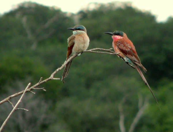 Beskrivelse: Selv en biæder kan blive lidt træt i farverne efter en lang ynglesæson - adult fugl med juvenil på slæb.