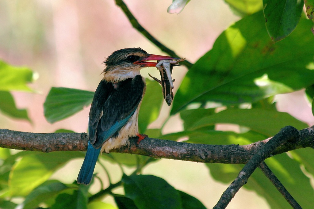 Beskrivelse: Dagligt sidder hunnen før parringen og kalder på hannen, der jævnligt (i perioder hvert 10 min.) fodrer hende med græshopper, biller, knælere mm. Af og til tager hunnen et bad i en swimming-pool ved siden af. Da han kom med et firben udløste det åbenbart parringen, der fandt sted straks hunnen havde spist øglen, hvilket dog tog ca. 10 minutter, da den først skulle "strømlines".