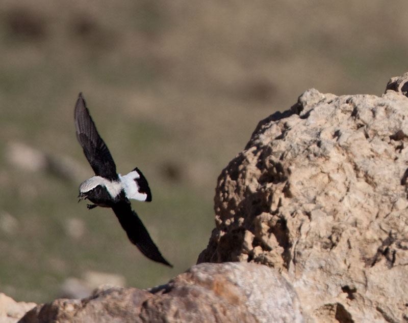 Beskrivelse: Hvidrygget Stenpikker med sorte strube, skuldre og vinger samt hvid ryg.