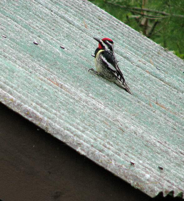Beskrivelse: En spætte, der øver trommesoloer på et eternit-tag, er bedre end et vækkeur!