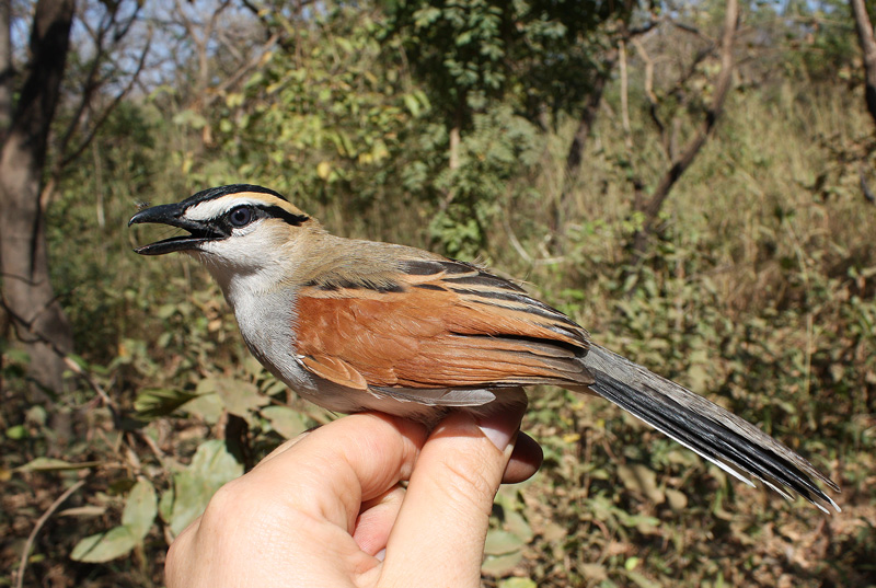 Først hed arten noget så udansk og lidet mundret som Sortkronet Tchagra, senere det storartede Hvidbrynet Kratskade (på dette foto ses jo tydeligt, at det man lægger mærke til netop er den brede LYSE øjenstribe)