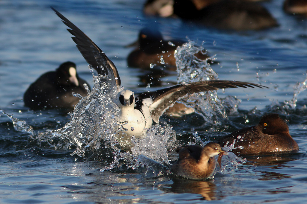 Beskrivelse: På bedste kjovemanér jagtede skalleslugerhannen den lille lappedykker rundt i manegen for at snuppe lappedykkerens bytte. Selv da lappedykkeren dykkede for at undslippe røverkarlen, fulgte den lille skalleslugerhan efter. I de efterfølgende tumulter så jeg ikke, hvem der vandt.