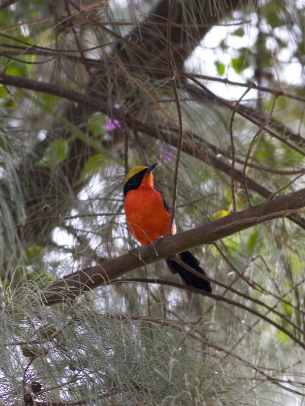 Beskrivelse: Høres overalt i Kotu-området, men ses sjældnere. Stemmen kan høres <a href='http://www.xeno-canto.org/africa/browse.php?query=Yellow-crowned+Gonolek'>her</a>. Som det sikkert kan høres, er navnet således et onomatopoietikon.