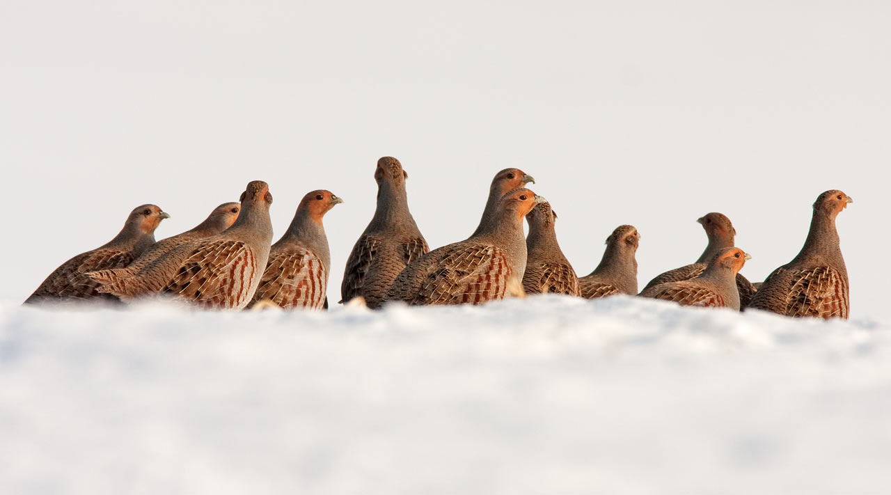 Der er ikke mange Agerhøns her i Nordsjælland hvor jeg bor. Hvis man skal finde dem er det nu hvor der er sne på markerne. Jeg fandt 3 flokke i dag (de 2 dog nær Roskilde, hvor der er flere). Alle stod midt på en stor hvid mark. Jeg har tænkt lidt over hvorfor. De kan nå at se alt hvad der nærmer sig over marken, men det må da være alt for let for en rovfugl?