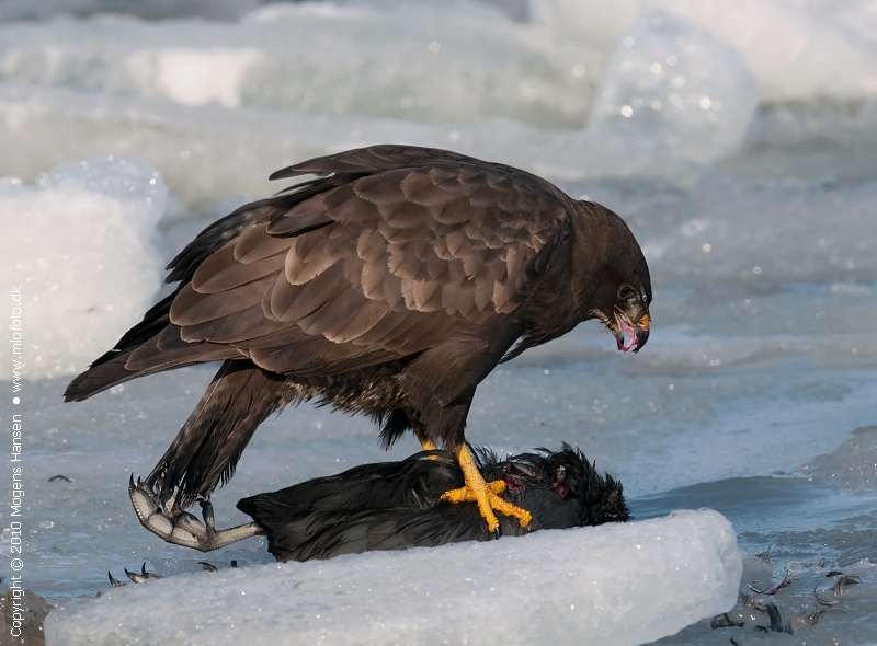 Beskrivelse: Stående på en isflage midt i havnen fortærede musvågen en blishøne, der åbenbart var blevet 'headhuntet' af en havørn