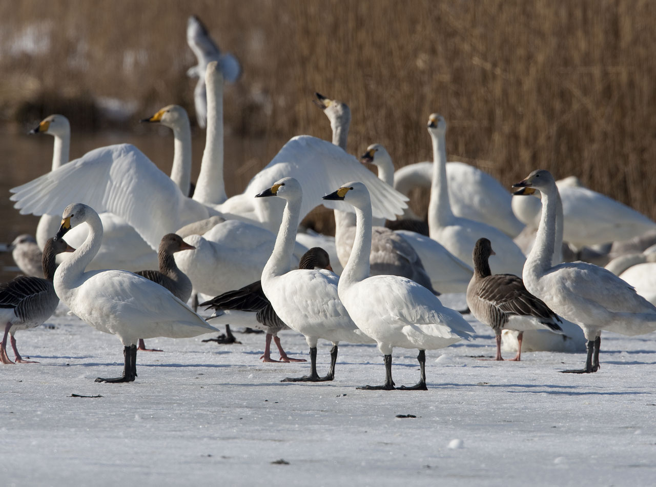 Titel: Pibesvaner med sangsvaner i baggrunden